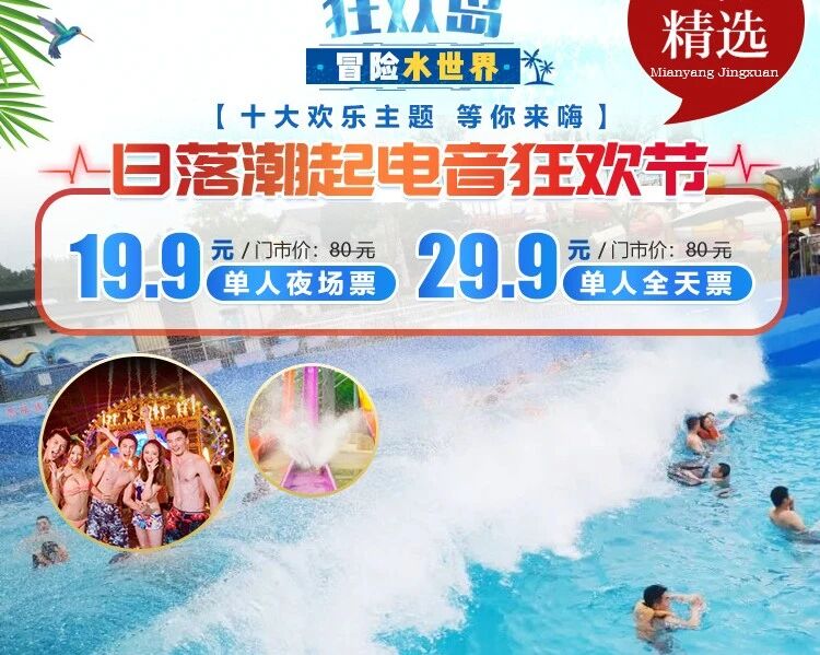 绵阳精选,交易担保,放心买,【狂欢岛冒险水世界】29.9元抢单人全天畅玩票,19.9元抢单人夜场票