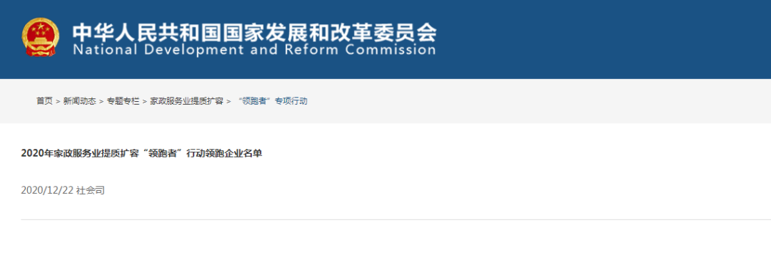 2020年12月22日,国家发改委社会司公布了2020年家政服务业提质扩容领跑者行动领跑企业名单,全国共有175家企业入选名单。