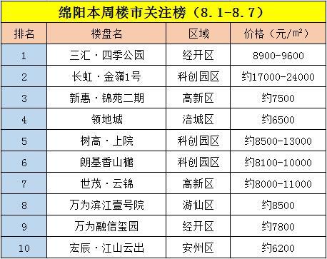 高新区为:新惠·锦苑二期(位于高新区双碑九组朗基天域后)、世茂·云锦(绵阳市高新区普明北路西段与二环路辅路交汇初)。