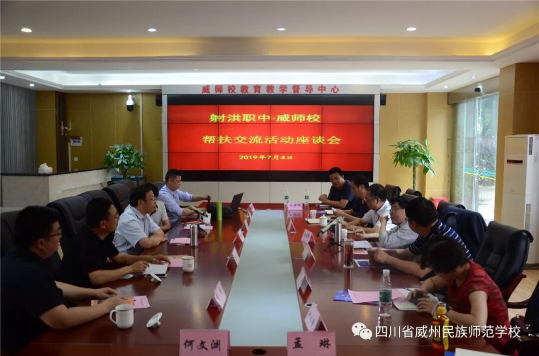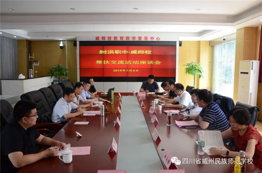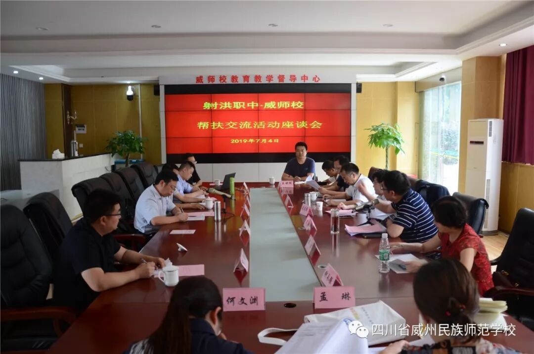 7月4日,射洪职业中专学校副校长余永双、罗先伟率该校就业部教务主任胥进、宣招办主任李阳、就业部教导处副主任黄静等来到我校,与我校开展了对口帮扶交流活动。校党委委员、副校长吴茂华、宋斌及有关科室负责同志和老师参加交流活动。