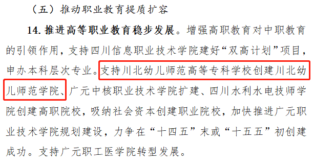 推进高等职业教育稳步发展。增强高职教育对中职教育的引领作用,支持四川信息职业技术学校建好双高计划项目,申办本科层次专业。支持川北幼儿师范高等专科学校创建川北幼儿师范学校、广元中核职业技术学校扩建、四川水利水电技师学校创建高职院校,吸纳社会资本创建职业院校,加快推进广元职业技术学校规划建设,力争在十四五末或十五五初创建成功。支持广元职工医学校转型发展。