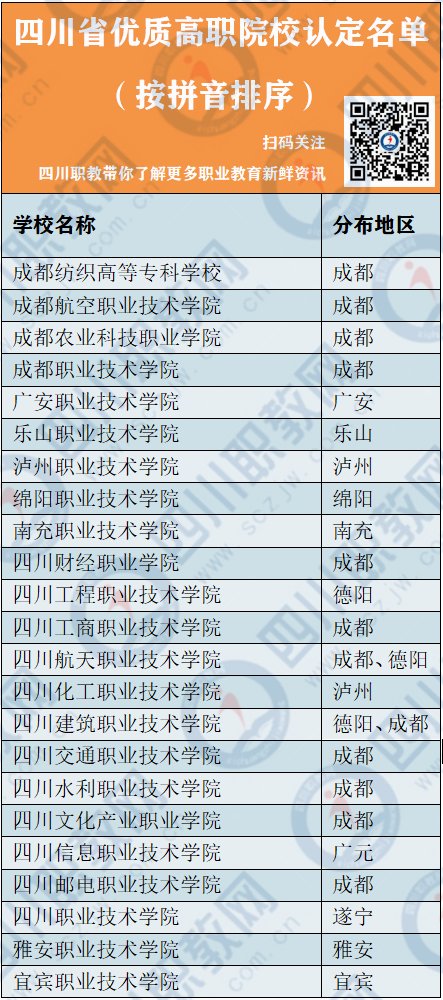 再有一个方法就是,可以看教育部公布的中国特色高水平高职学校和专业建设计划(简称双高计划)建设单位名单。全国197所高职院校进入双高计划建设名单,其中四川有8所高职院校入围。四川职教双高计划也于今年3月启动,将在全省遴选建设15所左右高水平高职学校和50个左右高水平专业群进行重点建设。