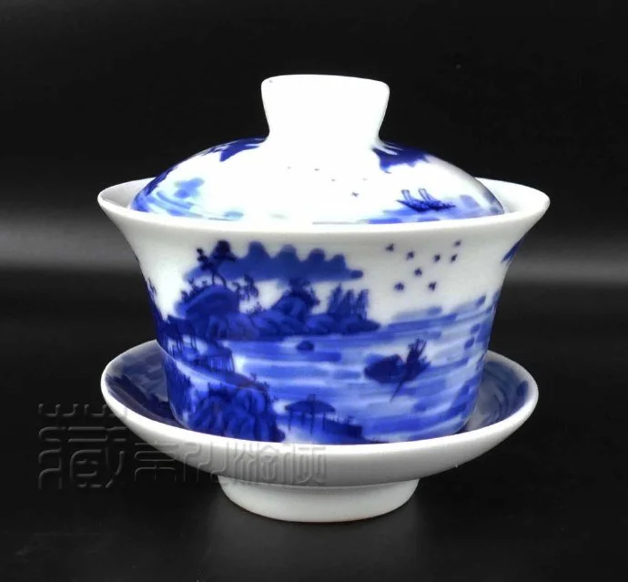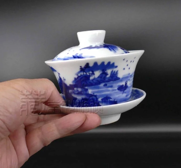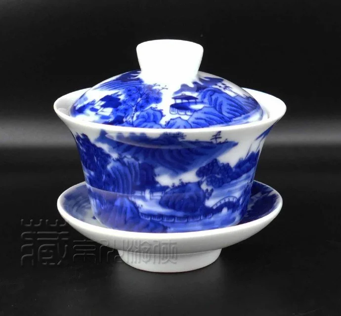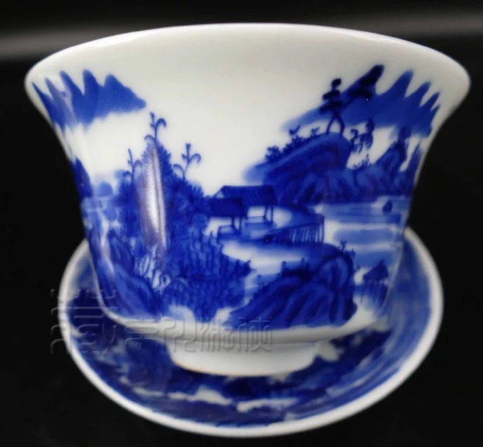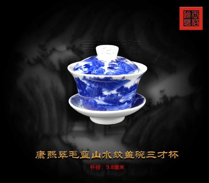 罕见的清康熙《翠毛蓝山水纹盖碗三才杯》珍赏