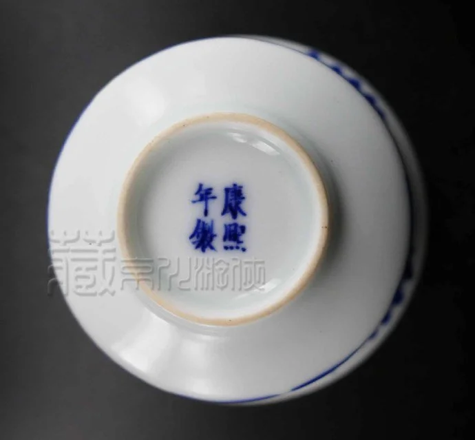 鉴赏本品。器形完整无缺,杯径约为9.8厘米,托、杯、盖三才齐整。一眼可识,其青花发色十分深沉,艳丽之感凸显,色翠如鸟羽,具有翠毛蓝青花的鲜明特征。整体釉色温润不贼,胎质致密,白釉色正。其纹饰则是在杯体、托内壁和盖上,描绘了三幅山水纹,青山绿水、乡居亭台、小桥蓬船,构图丰富,画显其工,好一幅山水画卷,与艳丽翠毛蓝相辅相成,可谓美纹美饰,十分养眼。复观其底,以浓艳翠毛蓝青花书写康熙年制四字款识,楷书书体,书相几分率意,颇见力道,更显自然。