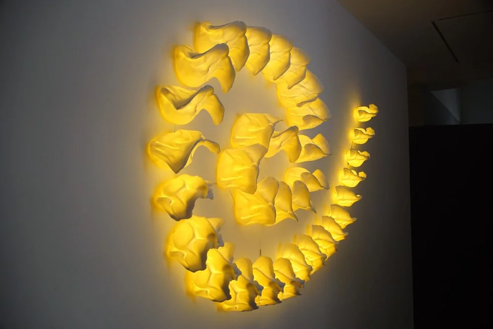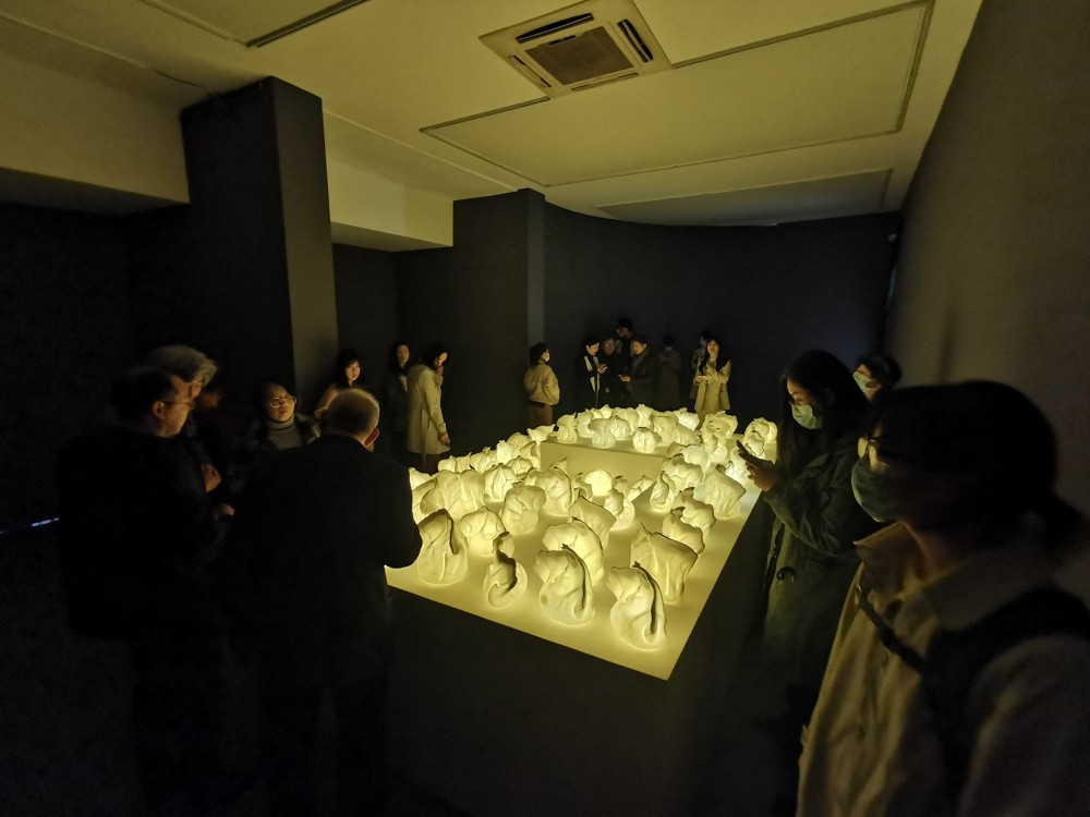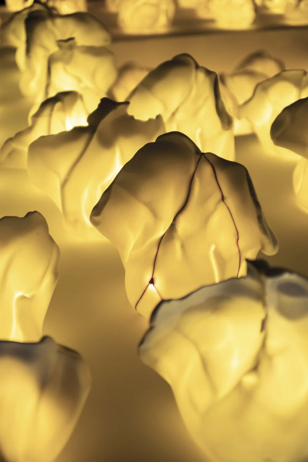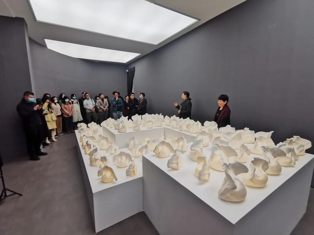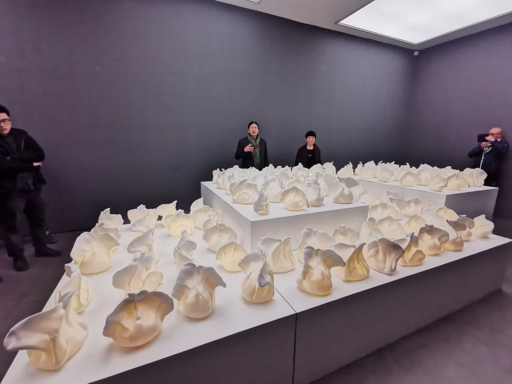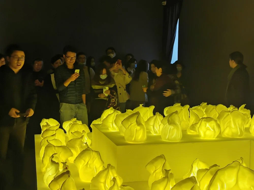 2021年,这批曾经的物质符号来到了转化的关键时刻,艺术家将其内部掏空,并创造性地改用白瓷且放大,最重要的,是将光引入饺子内部,当这些光从中生发,作品也就籍此获得了质性升华,原本的物质性被减弱,精神性提升,并借群体之力,成功转化为更高层面的艺术象征。因此,它们既是饺子,也化身为某种形式、材料和艺术符号的综合指症,成为艺术家在68岁时一次艺术面貌的重要公开呈现。