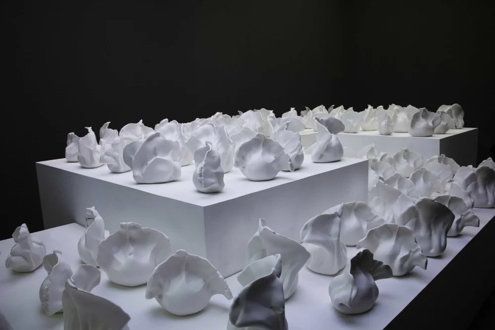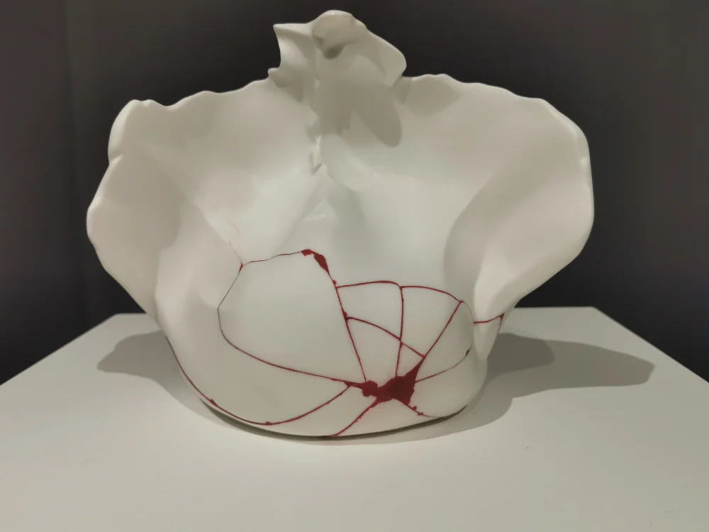 因此,这次展览中,缘于《饺子》而诞生的《修复》系列应运而生。因制作工艺等客观因素影响,白瓷材料的《饺子》不可避免地受到部分损坏,有些甚至裂开,艺术家多年沉浸于自然生命的体悟似乎在瞬间就赋予了它全新生命,修复后的白瓷饺子身体上布满了暗红色线条,新生儿出生时般的痕迹在洁白软糯的白瓷上具有了神秘的重生意义。修复,是一种理论,也是对待生命的态度。实际上,每个生命每天都在自我修复。李秀勤说。她的整个艺术创作是不断生长的,在工作中学习,在过程中产生新的作品,生生不息的艺术创作籍此带来了意想不到的神奇因果。