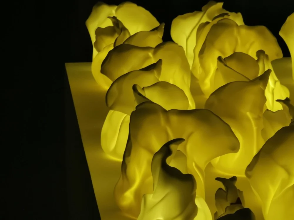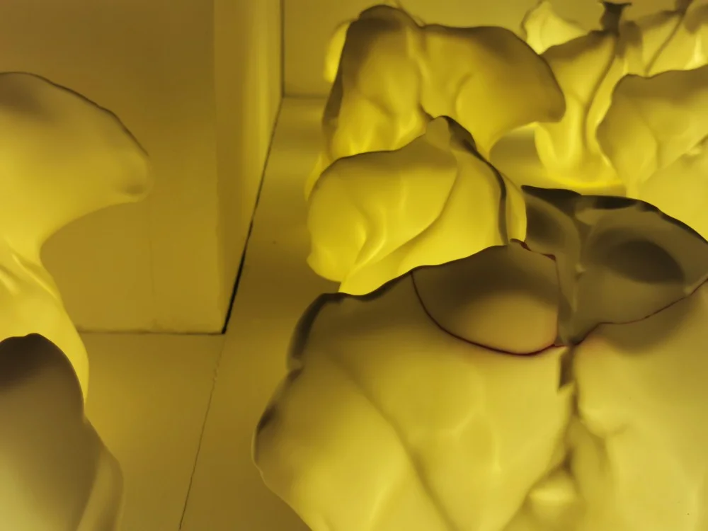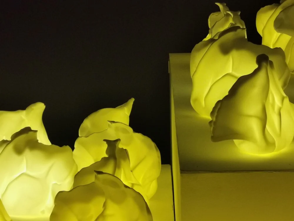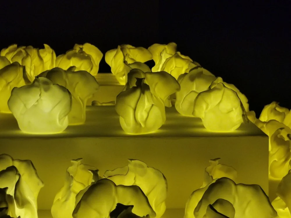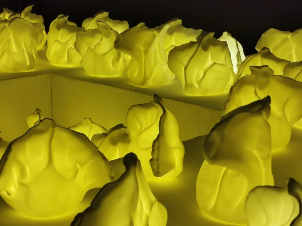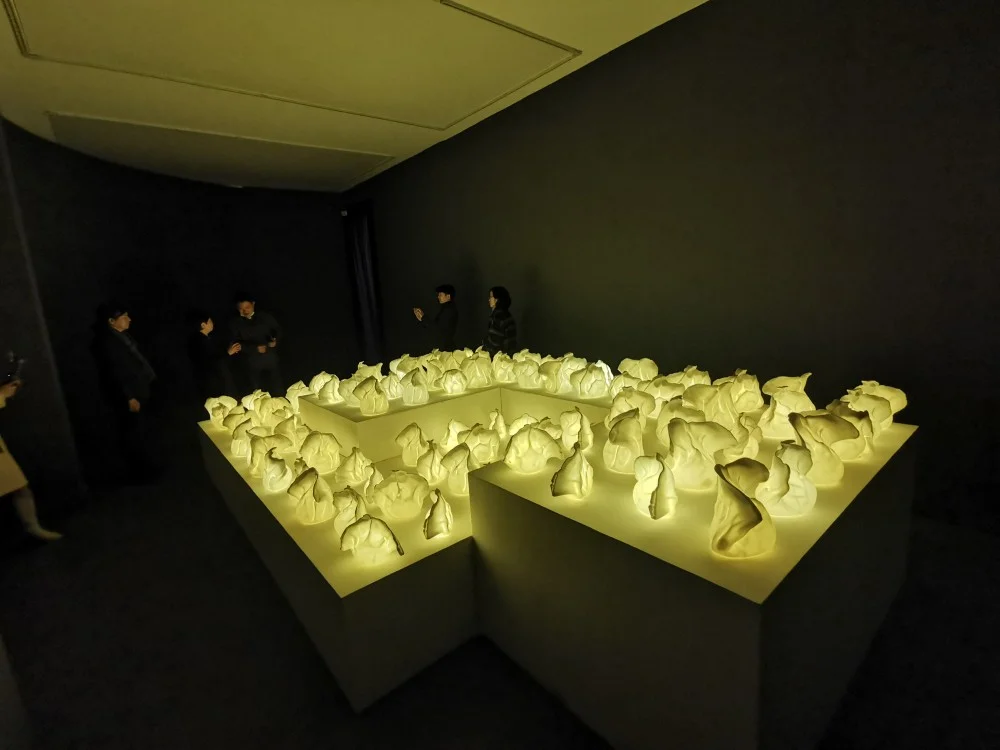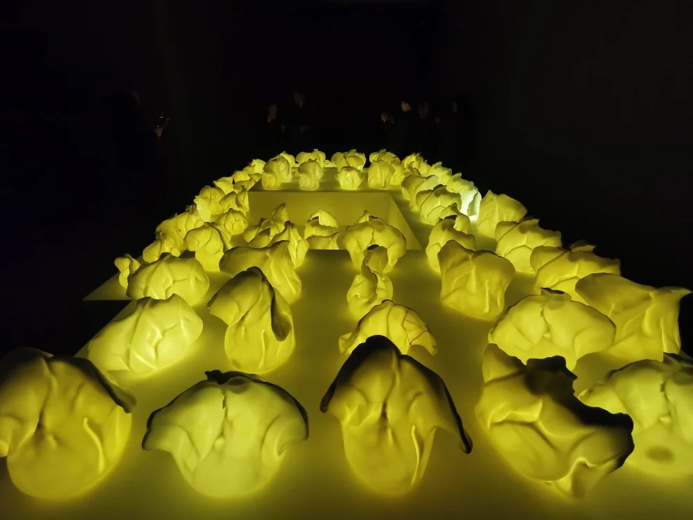 这次,人可也特别用心地拿出一个独立空间做精心呈现。当观众掀开垂下幕帘进入暗调空间时,焕发微黄灯光的饺子们群体立于展台上,聚在核心空间内,形态个个不同但又个个类似,气势恢宏的同时又奇妙地具有温柔坚定的力量,在瞬间牢牢抓住观者眼光,极其震撼人心。