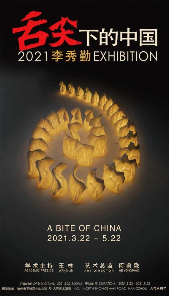 2021年3月22日,李秀勤最新个展《舌尖下的中国》在人可艺术中心隆重启幕,百件全新塑造的饺子恢弘登场,更携诸多新作与多元系列,为艺术家二十余年凹凸间的艺术探索再添新节点。