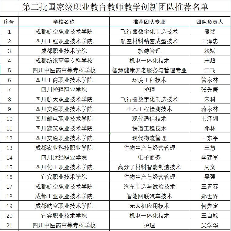 4月30日,省教育厅人事与教师工作处发布公示,经逐级审核、推荐、评审,拟确定成都航空职业技术学校熊熙、四川工程职业技术学校王泽忠等35个团队为四川省第二批国家级职业教育教师教学创新团队推荐对象。公示时间为2021年4月30日至5月10日。(省教育厅)