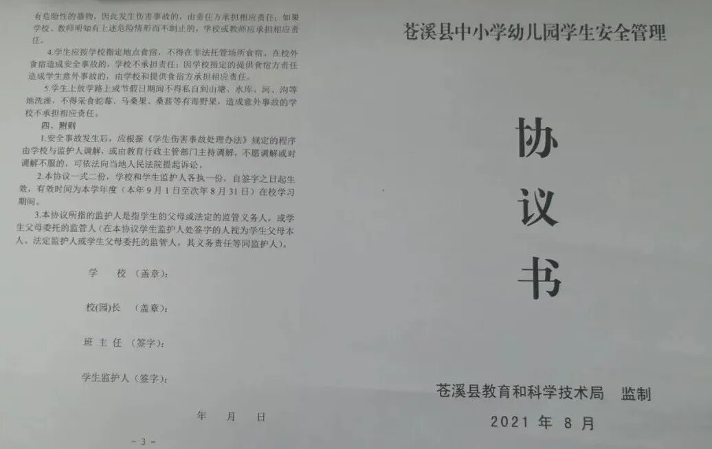 2024届学生和本期新转入我校的2022届、2023届学生假期将《苍溪县中小学幼儿园学生安全管理协议书》(每生两份),让家长签字后,一份交由家长保存,另一份国庆收假时交回班主任老师处。
