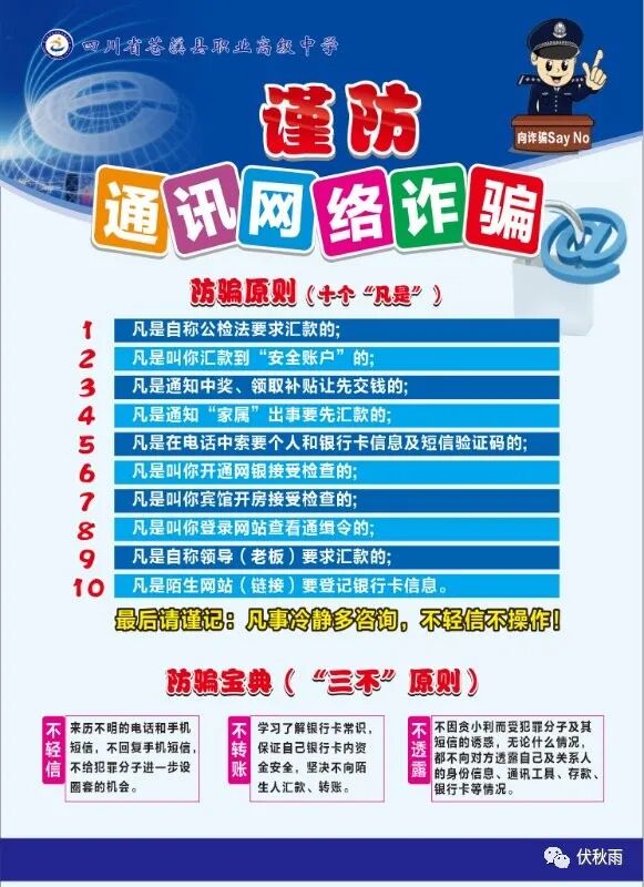 8.防诈骗。学生要提高警惕防诈骗,天上不会掉馅饼,不要给网上不名身份的人和朋友发红包或转现钱,假期学生防盗、防人身侵害等。