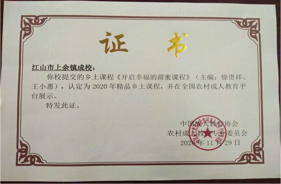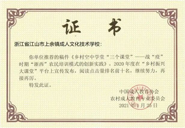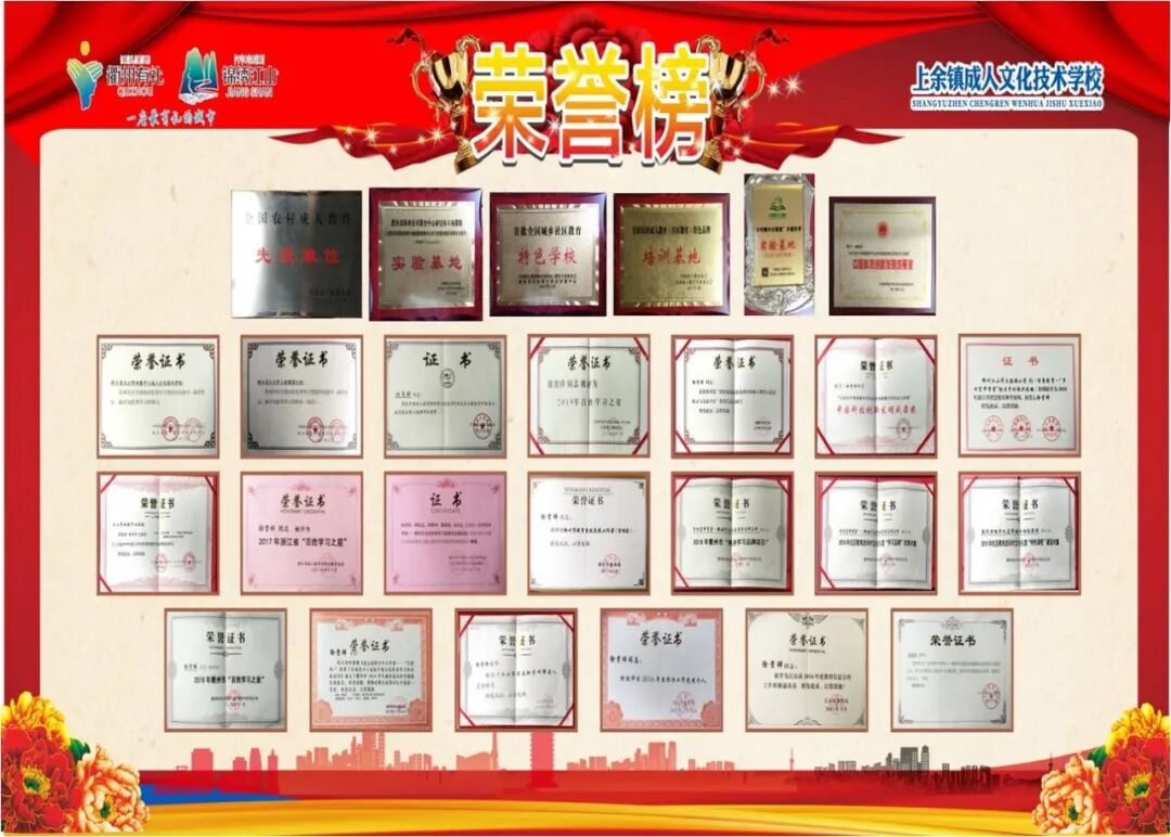学校举办的一系列兼具实用性、互动性、趣味性、教育性的培训活动,受到了农民的热烈欢迎,办学取得了显著成效。2017年被省教育厅评为浙江省现代化成校,望江社区又被中国农村成人教育委员会评为全国优秀学习型村居,《亲子共育课程》项目被评为浙江省特色品牌项目,徐贵祥老师被评为浙江省百姓学习之星......村民群众对成校教育的参与度、认同度和满意度得到显著提高。2020年9月,《新农村》杂志也对上余镇成校的办学情况作了专题报道。