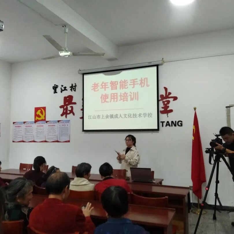 衢州电视台记者在上余镇成校举办老年智能手机使用培训之际,对学校进行采访。