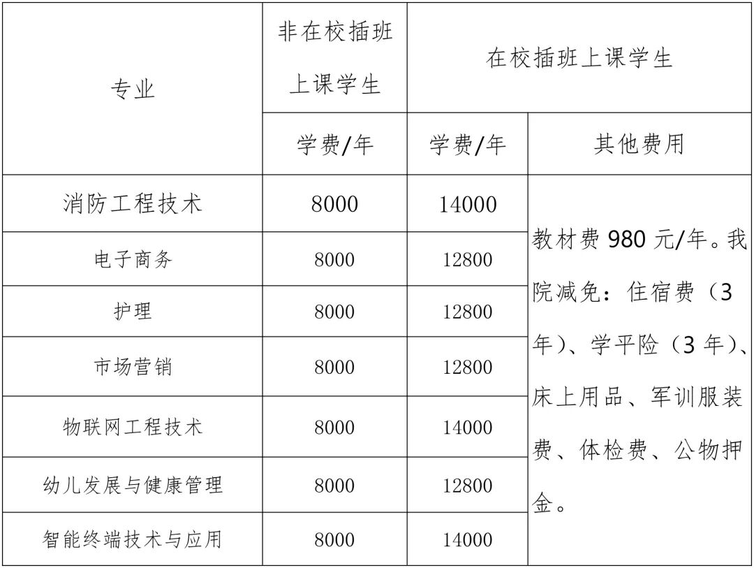 备注:申请并经过学校同意在校插班上课的学生,按照在校生的收费标准进行收费,除了基本的学费还需缴纳教材费。