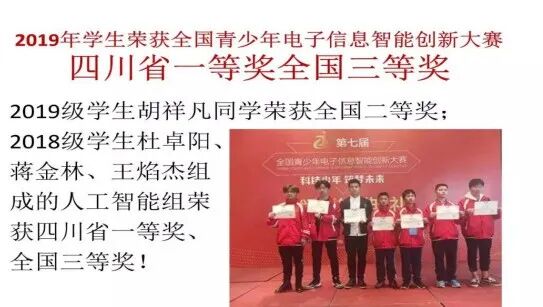 2019年,学生参加四川省教学质量监测考试取得了优异成绩,参加全国电子信息创新大赛1人获得全国二等奖、3人获得全国三等奖、3人获得四川省一等奖。2020年1月,有8名学生参加了北京景山学校组织的喜迎奥运相聚崇礼的冬令营研学活动。学校的教育环境特别适合学生成功成才。