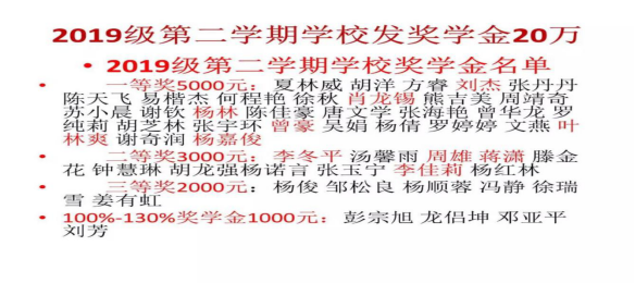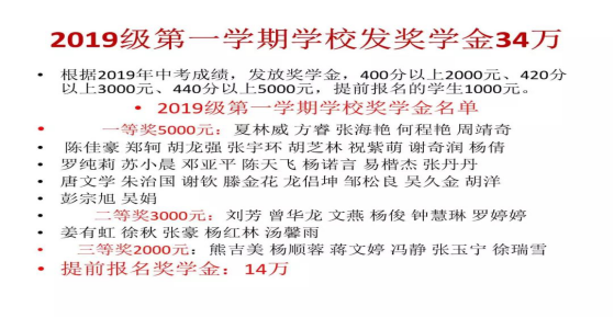 第一学期中考成绩在普高录取控制线60分以上奖学金2000元;80分以上奖学金3000元;100分以上奖学金5000元。每一期按照这个标准执行,从第二学期开始,实行动态管理。除此之外的学生,提前报名奖学金1000元。