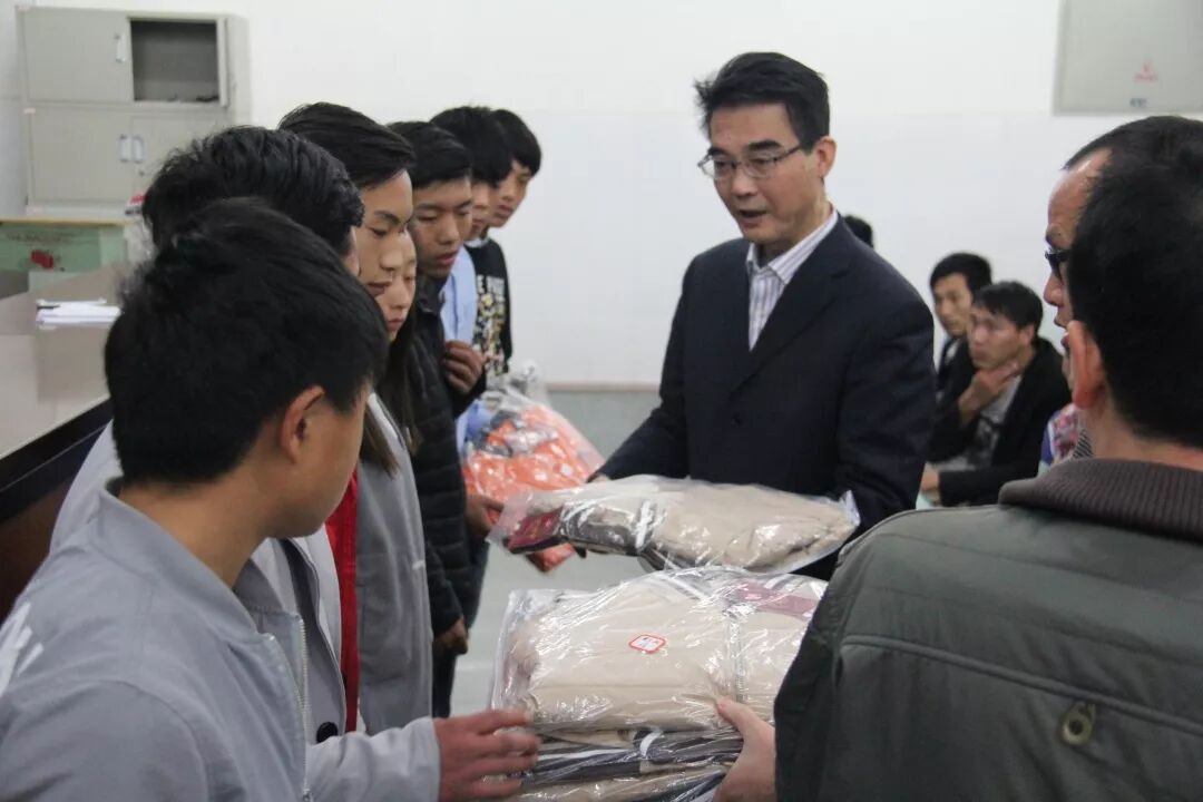 校长曾顺斌(中)为9+3学生发放冬衣