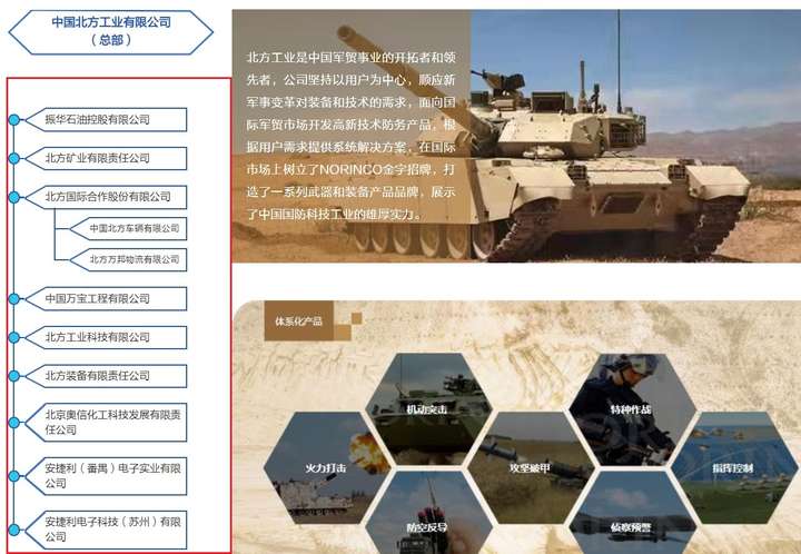 中国北方工业有限公司主要从事防务产品、石油及矿产资源开发、国际工程承包、光电、民爆化工、运动器材、车辆、物流等业务,资产和销售收入位居中国最大500家国有企业前列。