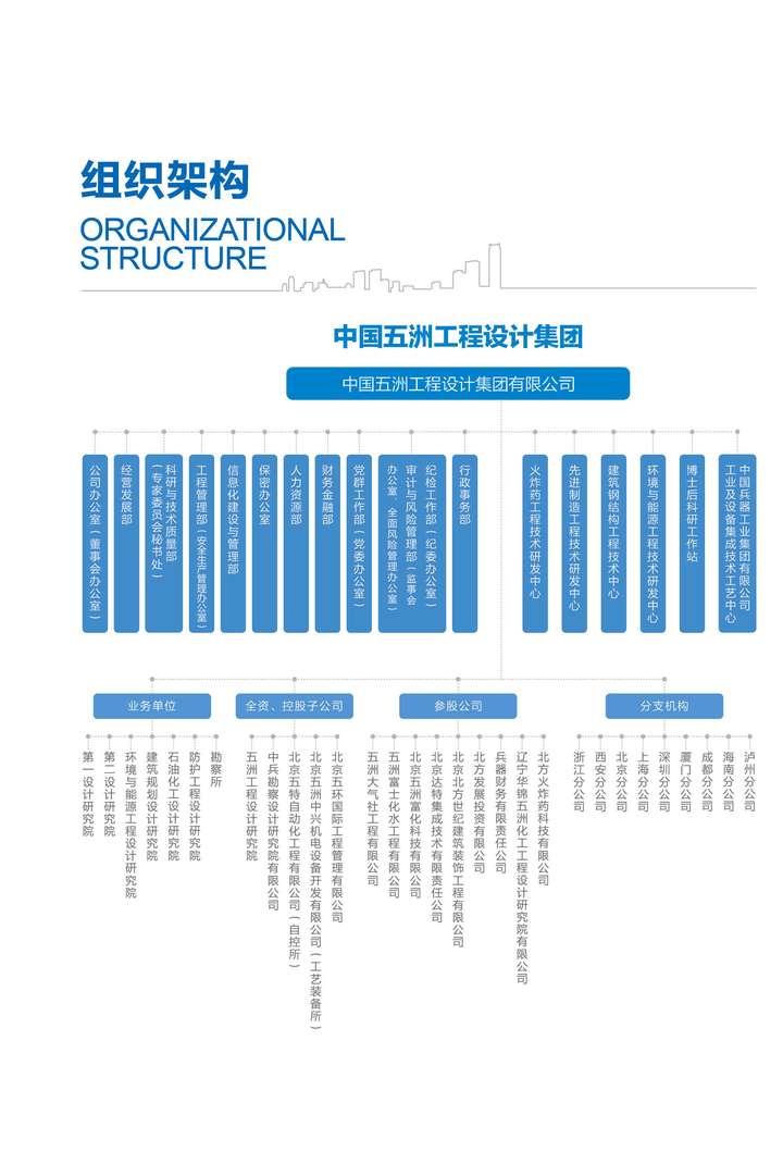 公司注册资本1亿元,现有员工1300余人,配置有坦克装甲车辆、发动机、弹箭、枪械、光电、建筑、结构、综合工程、非标设备、工程测量、岩土工程、地质勘察等50多个主要专业。公司设有包括军工工业工程、民用建筑、工程勘察设计等多个综合设计院所和热能电力、电磁防护、环境工程、园林景观等多个专业性设计研究所;在北京、上海、深圳、重庆、南京、厦门、大连、青岛等地设有分支机构。