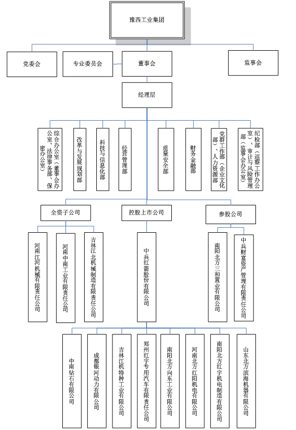 豫西集团总部位于南阳市高新区,现有军品分公司、北京理工大学豫西弹药引信研究开发中心、中南地区退役弹药拆分利用销毁中心、国防工业区域计量站、北京办事处5个直属单位;河南江河机械责任有限公司、河南中南工业有限责任公司2个全资子公司;中南钻石股份有限责任公司、郑州红宇专用汽车有限责任公司、南阳北方向东工业有限公司、南阳北方红宇机电制造有限公司、南阳市红阳锻造有限公司、南阳红阳工程机械有限公司6个控股子公司,下属二级、三级子公司分布于郑州、南阳、鲁山、南召、方城、中牟、深圳、江西、连云港等地,拥有职工8000余人。