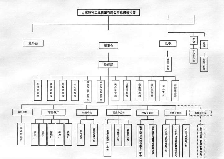 山东特种工业集团有限公司创建于1949年1月,由跟随部队的修械厂(所)合编组建,地处鲁中腹地的淄博市博山区。 公司现有员工近3000人,各类专业技术人员800余名,占地面积280万平方米,资产总额9.8亿元,具有铸锻、机加、冲压、铆焊、工模具、热处理、表面处理、精密压注药等较完备的综合设计、测试和制造能力,民品具有自营进出口权。