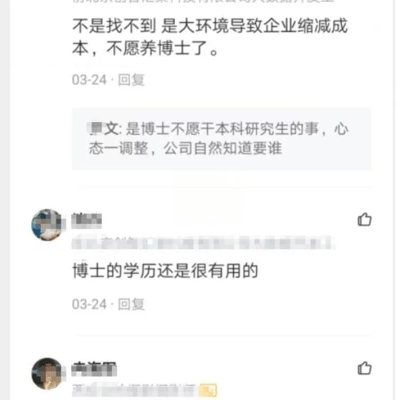有网友觉得,不是没找到,,是大环境导致企业缩减成本,不愿意养博士罢了。更何况不少博士都不愿意干研究生的事情,每个人都有野心,心态一调整,公司自然知道要招谁。也有网友觉得,是人才任何时候都不缺工作,政府现在也在做抢人的工作,优秀的人自然是香饽饽,不用上门找大家自然会挣着抢。别说博士了,研究生都是有哪香哪,政府人才引进政策很不错的。
