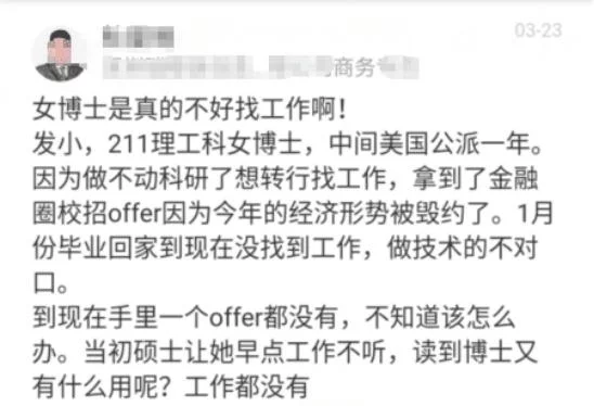 这位网友感慨道,发小是211理工科女博士,中间美国公派一年。因为做不动科研了想转行找工作,拿到了金融圈校招offer,因为今年的经济形式被毁约了。1月份毕业回家到现在还没有找到工作,做技术的不对口。到现在手里一个offer都没有,不知道该怎么办。当初硕士让她早点工作不听,读到博士又有什么用呢?工作都没有!