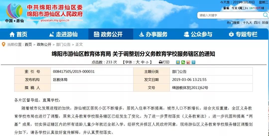 2.学区划分:按照《关于调整划分义务教育学校服务辖区的通知》(绵游教体发〔2011〕62号)执行。可在游仙区政务网(http://youxian.my.gov.cn/)查询,也可在就近学校的公告栏查询。