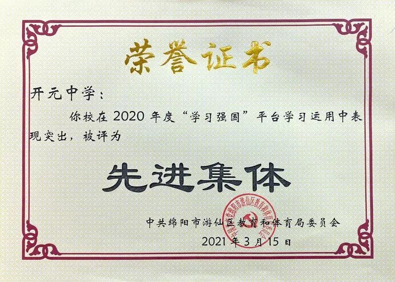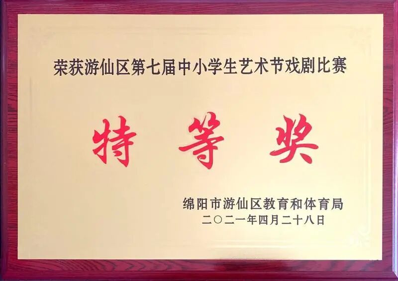 此外,学校先后荣获全国青少年冰雪运动特色学校、全国国防教育特色学校、全国青少年校园足球运动特色学校、四川省阳光体育示范学校、游仙区第七届中小学生艺术节戏剧比赛特等奖、游仙区第七届中小学艺术节声乐比赛和舞蹈比赛一等奖等160余个国家、省、市和区级荣誉。学校连续5年荣获区教育目标综合考核特等奖、连续2年荣获市教育目标综合考核特等奖。