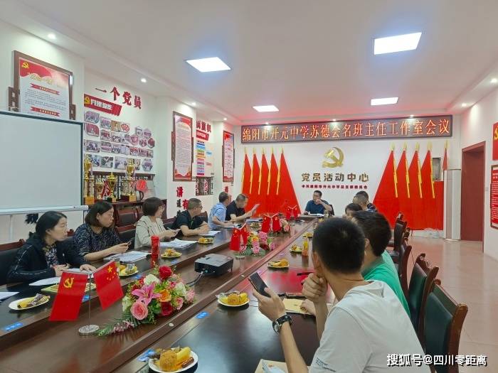 2022年5月26日下午17:00,绵阳开元中学在学校党员活动中心召开苏德会名班主任工作室第一次会议,学校党总支书记、校长王力,副校长敬正雄、肖柯和学校名班主任苏德慧出席会议,陈小华、廖波等12名班主任参加,会议由学校教科室主任唐凌云主持。