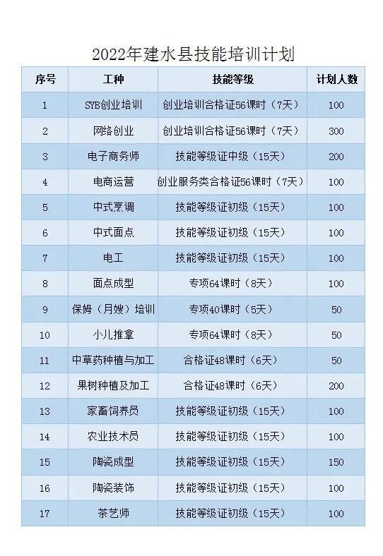 为深入贯彻落实《云南省人民政府关于实施技能云南行动的意见》(云政发〔2021〕28 号)、《云南省人力资源和社会保障厅关于做好2022年职业培训工作的通知》(云人社通〔2022〕8号)文件精神,充分发挥职业技能培训在稳就业、保就业中的积极作用,统筹推进常态化疫情防控和劳动力转移就业培训工作,以实现更加充分更高质量就业为主要目标。本次培训项目将通过向社会公开、公正招标的形式选取优质的培训机构,并在全县范围内举行职业技能免费培训专项行动,以提高务工人员技能水平,增加务工收入。具体培训情况如下: