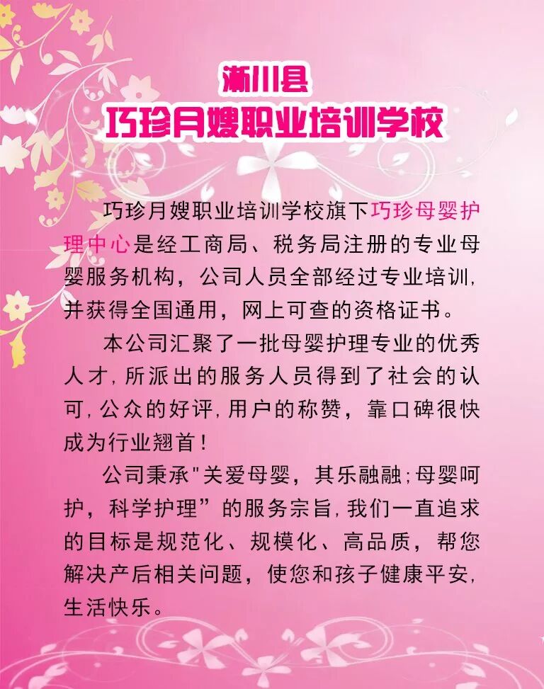 淅川县巧珍月嫂职业培训学校,是劳动局批准的,民政局有办学资质的,学校下设的母婴护理中心的服务人员,上岗后年收入可达6-10万元,真正实现稳定就业。