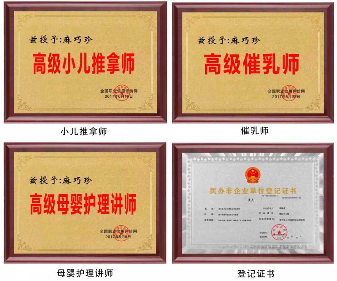 巧珍月嫂的主讲导师麻巧珍女士,取得的母婴护理导师、高级催乳师、小儿推拿师、营养师证书,而且评定职称还是高级的哟,这是一般的培训机构取得不到的优势!