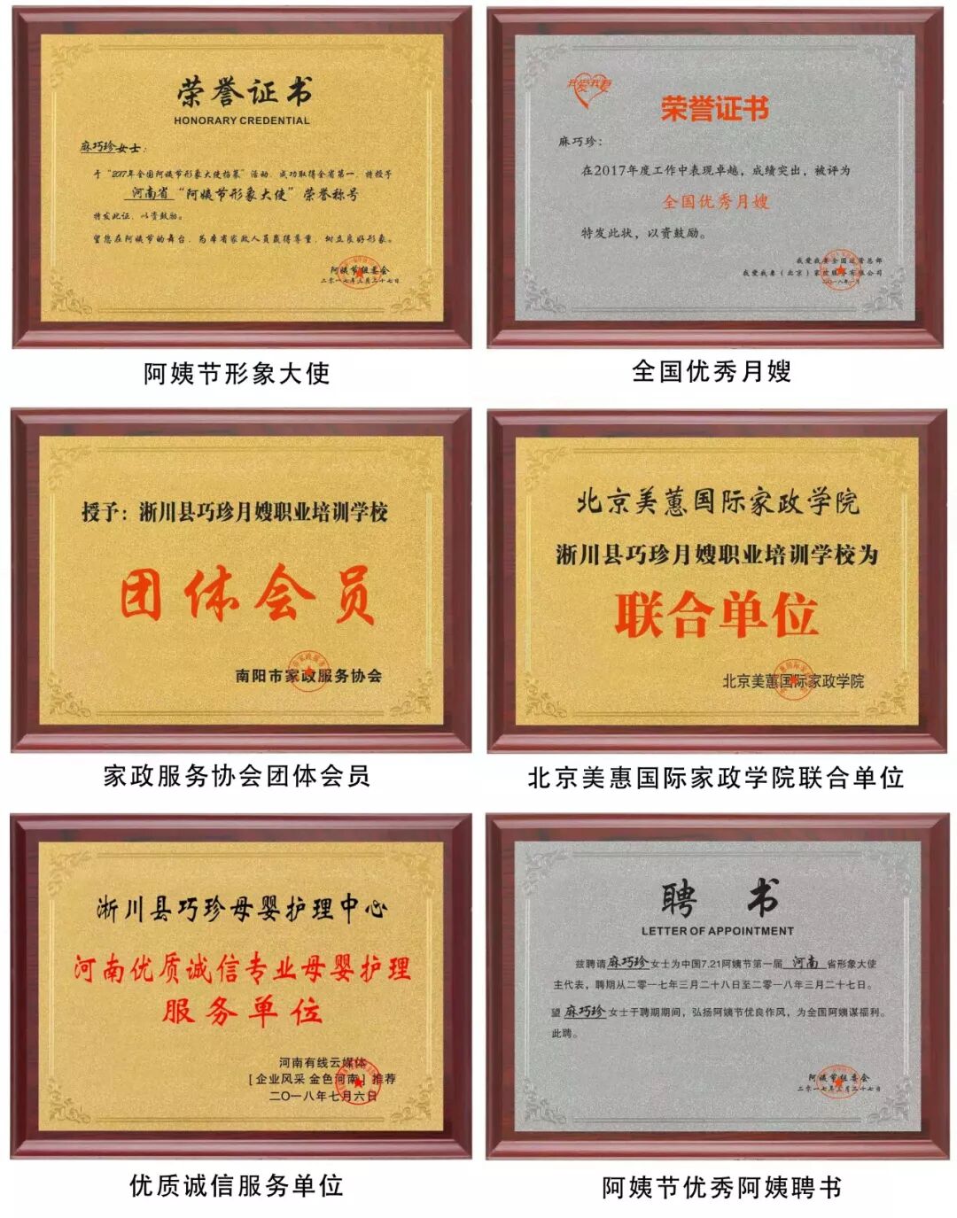 巧珍月嫂职业培训学校的麻巧珍女士曾荣获全国优秀月嫂、河南省阿姨节形象大使等荣誉。