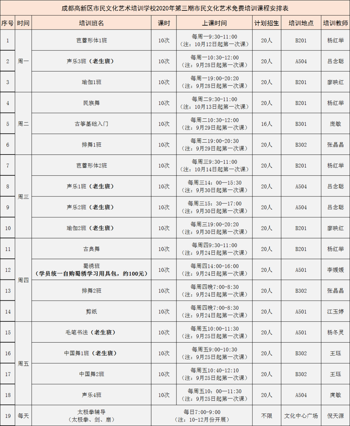 2、请广大市民朋友报名前仔细阅读《高新区市民文化艺术培训学校2020年免费培训班课表》,根据您自己的兴趣爱好、身体状况和时间认真考虑。对于一些有剧烈运动的课程,请您务必谨慎参与。