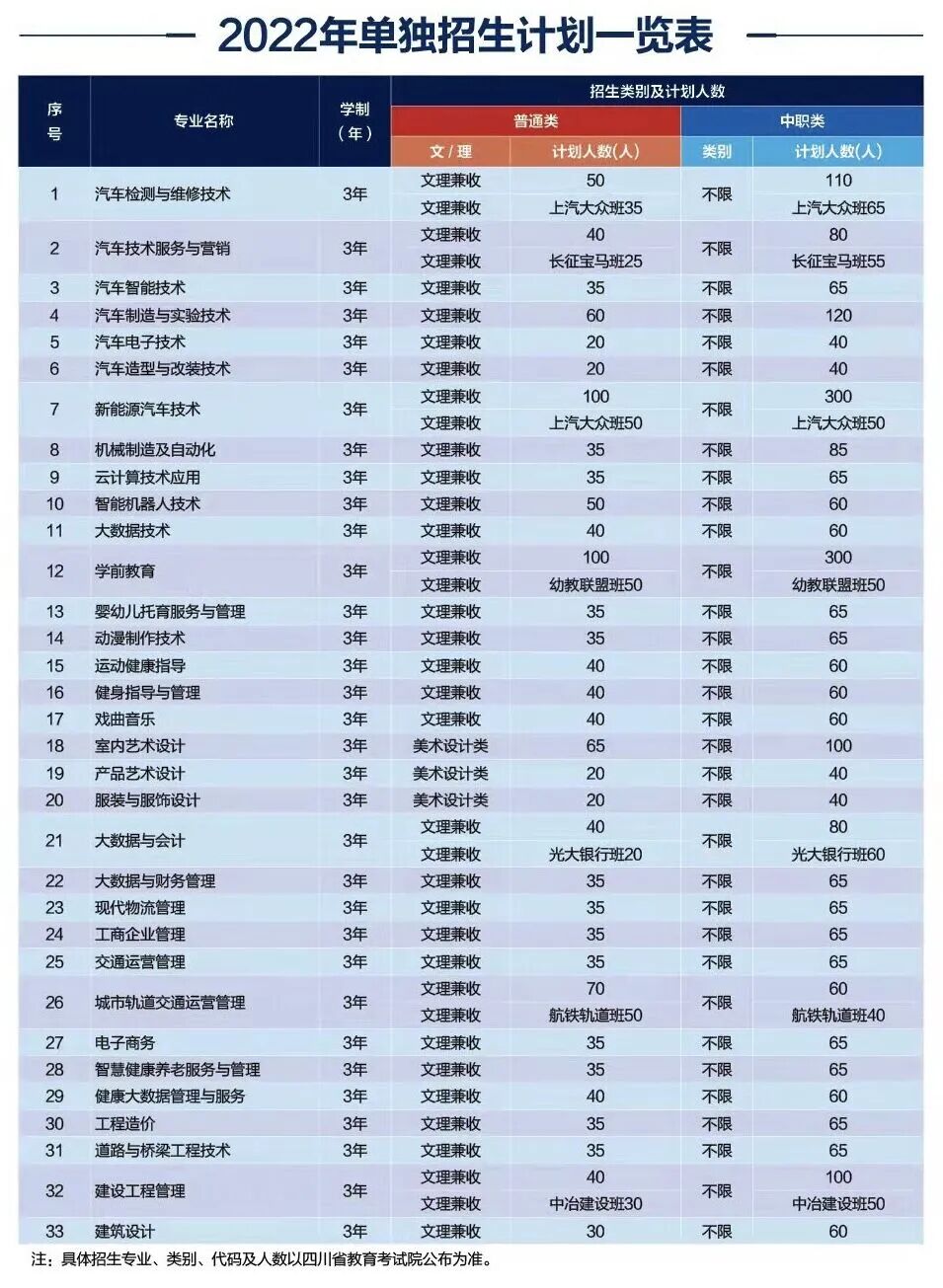 为保证2022年普通高校高职教育单独考试招生(以下简称高职单招)工作的顺利进行,根据四川省高职单招工作统一部署,结合我校实际情况,特制订本章程。