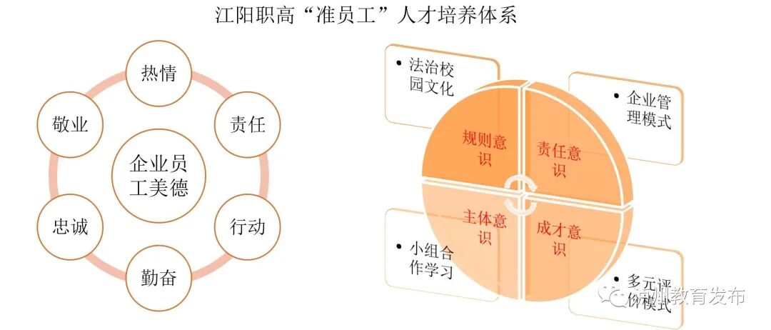 学校坚持培养德智体美劳全面发展、具有综合职业能力的社会主义劳动者,积极践行社会主义核心价值观,与职业教育特点相融合,将德育融入到学生日常活动中,融入到学生的能力培养中,形成江阳职高“准员工”人才培养体系。