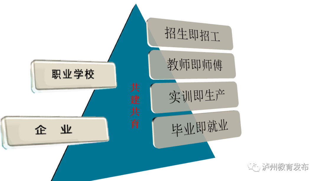 江阳职高在董允坝农业示范园建成新型职业农民培训学校,在江南科技产业园区建成实训基地,开展“3+2”工学交替人才培养的探索。与上汽集团、泸州西南无人机等十多家企业共建订单班,实现“招生即招工、教师即师傅、实训即生产、毕业即就业”的专业共建、学生共育的“准员工”人才培养。招生即招工