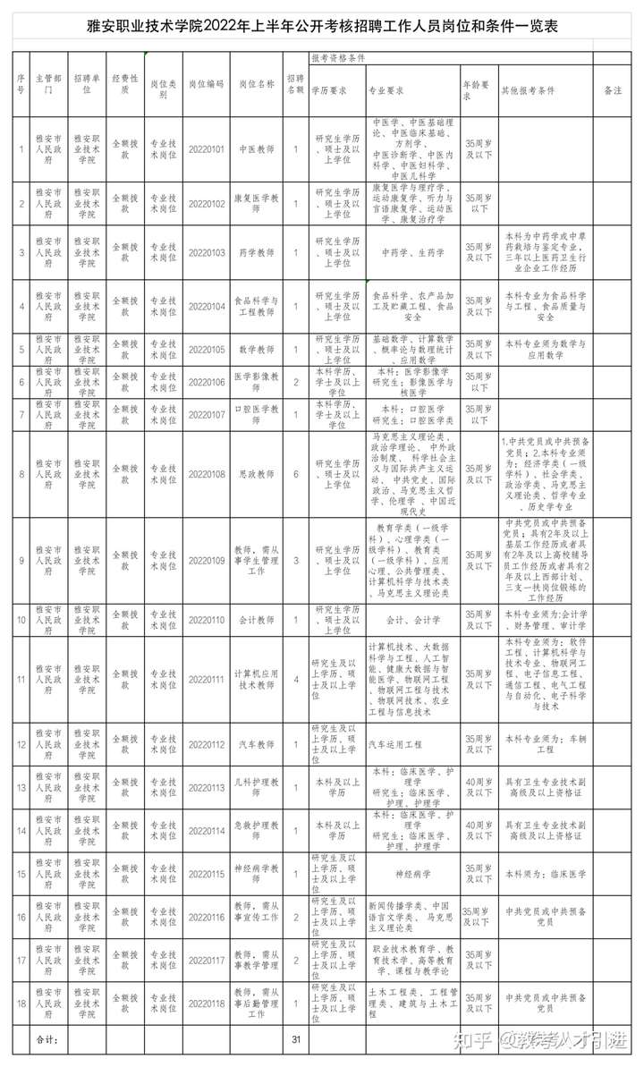 2022上半年四川雅安职业技术学校考核招聘31人。