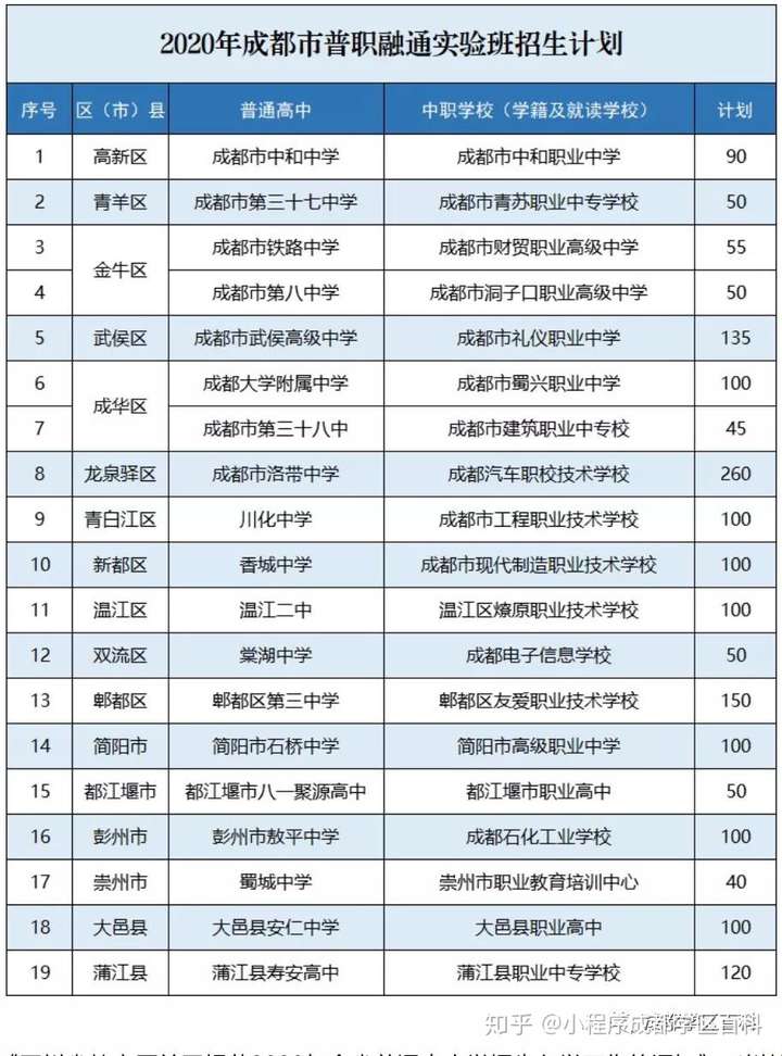根据《成都市教育局关于推动普职融通育人模式改革的意见》,成都市2018年开始普职融合改革试点。2020年,成都市一共有17个区县19个中职学校分别与区内普通高中结对举办普职融通实验班。
