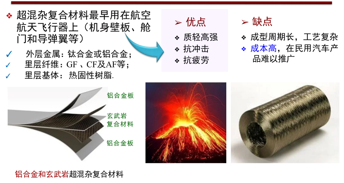 超混杂复合材料是指金属薄板和纤维复合材料交替铺层,在一定的温度和压力下固化而成的一种层间混杂复合材料,一般外表面为金属,内层是树脂基纤维复合材料。新型超混杂复合材料是汽车覆盖件轻量化的首选材料,在汽车行业有巨大市场,同时在高铁、城铁及通用航空领域也有广阔的市场空间。比铝合金减重20%以上,力学性能提高25%以上,极利于节能环保;保持现行汽车等覆盖件的成型与喷漆工艺,表面质量高,大幅降低制造成本;综合考虑减重效益和成本,费效指数远高于铝合金等轻质材料;具有良好多功能性,大幅提高乘坐安全性和舒适性。
