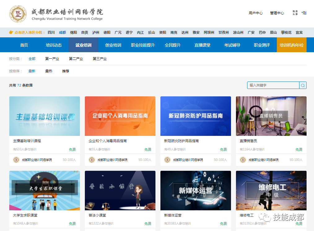 当前,疫情防控形势十分复杂,防控形势尤为严峻。为贯彻落实市疫情防控指挥部《关于加强各行业领域疫情防控管理的通知》(行业疫情防控〔2022〕5号)关于应当“开展以线上为主、线下为辅的培训班和开展线上平台直播课,减少面授课程,增加线上课程,减少人员聚集,降低疫情防控风险”的要求,我中心现向各单位全面免费开放成都职业培训网络学校(以下简称学校,登录网址:https://px.cdhrss.chengdu.gov.cn:8443/)平台应用和课件资源,帮助各单位开展在线授课和培训。现将相关事宜通知如下。