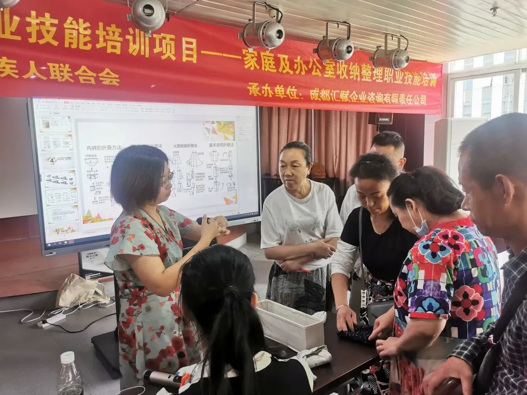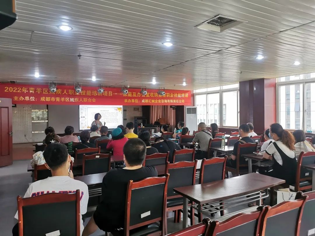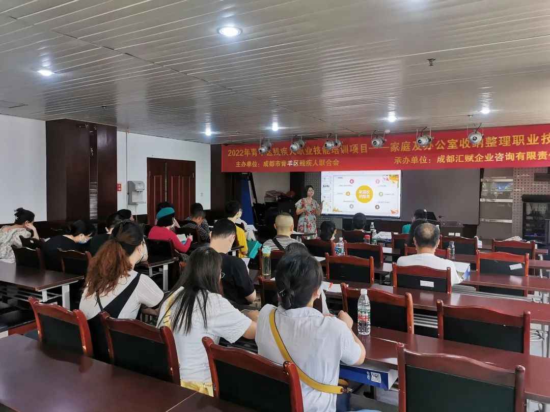 为提升残疾人就业技能和综合素质,以及生活幸福感,同时使其职业技能水平能够达到行业标准要求,将其推上就业岗位,帮助他们实现社会就业。易企心与青羊区残疾人联合会共同打造“吾声技校”,通过线上+线下的培训模式。近期我们为残友们开展了2022年第二期残疾人职业技能培训——家庭及办公室收纳整理,帮助残疾人实现人与空间、人与物品之间的和谐,从而达到在家庭环境及办公环境里的净化心灵作用,形成一个良好的物理家庭及办公环境。此次为期一天的沙龙活动在2022年6月24日成都市青羊区残联圆满结束,参与学员达20余人。