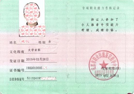 2、结业后,参加我中心组织的国家人力资源与社会保障部统一考核认证,合格者可获取《小儿推拿》专项职业能力证书,人社官网可查,全国通用。