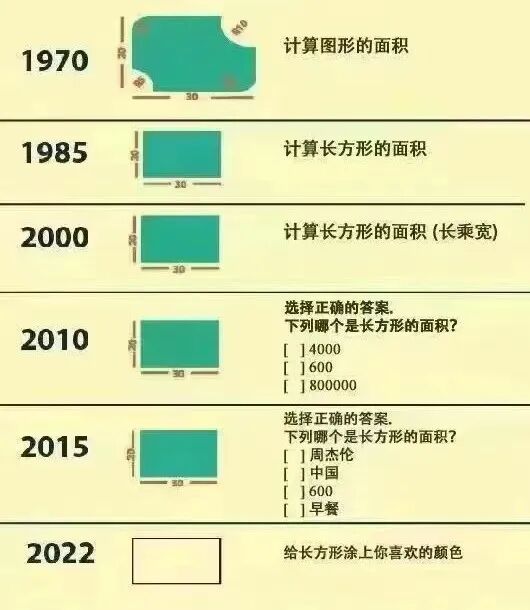 还有杭州、重庆等各地城市,都有类似的情况发生。有网友做了这样一张图,调侃中考的难度演变。