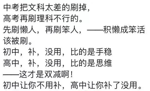同时,疯狂刷题的孩子感觉刷题或许并不能掐尖了,运气和考试状态的因素占比越来越大,那久而久之,减负的目就达到了,因为家长慢慢接受了“补课不再有显著效果”的事实。