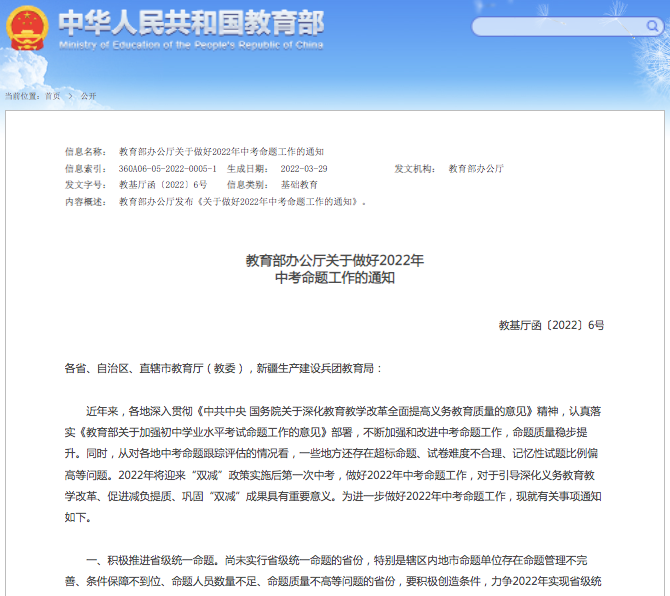 今年4月份,从教育部颁布的《2022年中考命题工作通知》中,我们就能看出一丝端倪。