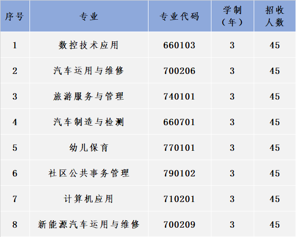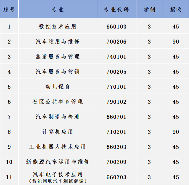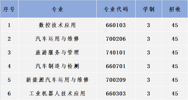 机械加工技术、数控技术应用、汽车制造与检测、汽车运用与维修、汽车电子技术应用、计算机专业、新能源汽车运用与维修、工业机器人技术应用:男身高1.60米以上,女身高1.52米以上,身体健康、无残疾。