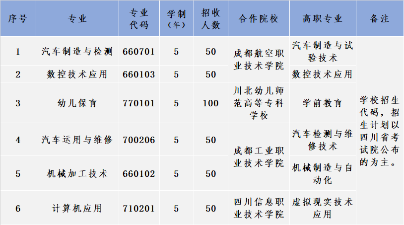 我校与成都航空职业技术学校合办的汽车制造与检测和数控技术应用,汽车制造与检测专业学生五年都在成都汽车职业技术学校学习,数控技术应用专业学生前三年在成都汽车职业技术学校学习,后两年在成都航空职业技术学校学习。