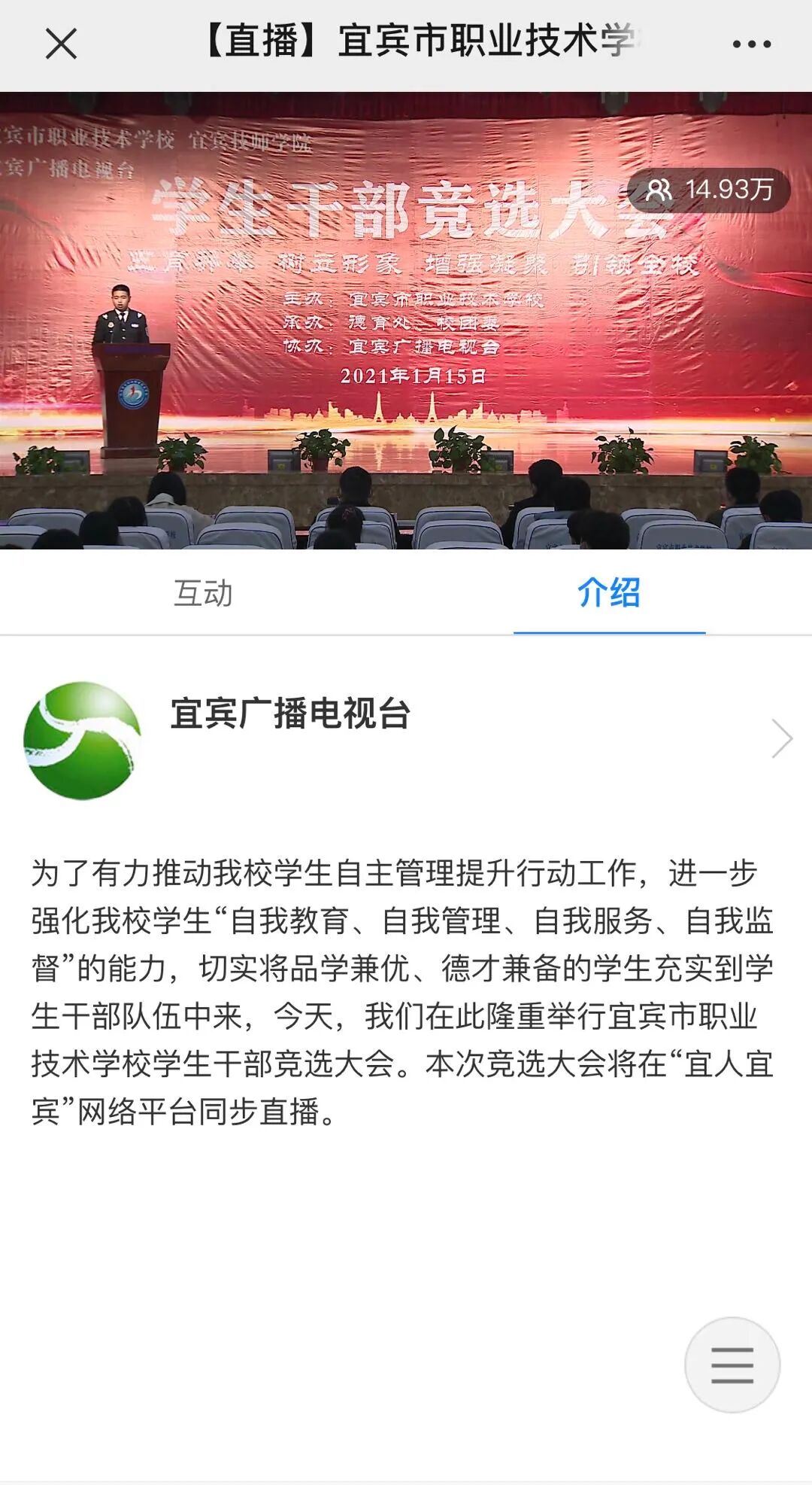 为了有力推动我校学生自主管理提升行动工作,进一步强化我校学生“自我教育、自我管理、自我服务、自我监督”的能力,切实将品学兼优、德才兼备的学生充实到学生干部队伍中来,我们隆重举行了宜宾市职业技术学校学生干部竞选大会。本次竞选大会还在“宜人宜宾”网络平台同步直播,最高峰时,点击量达53万人次!